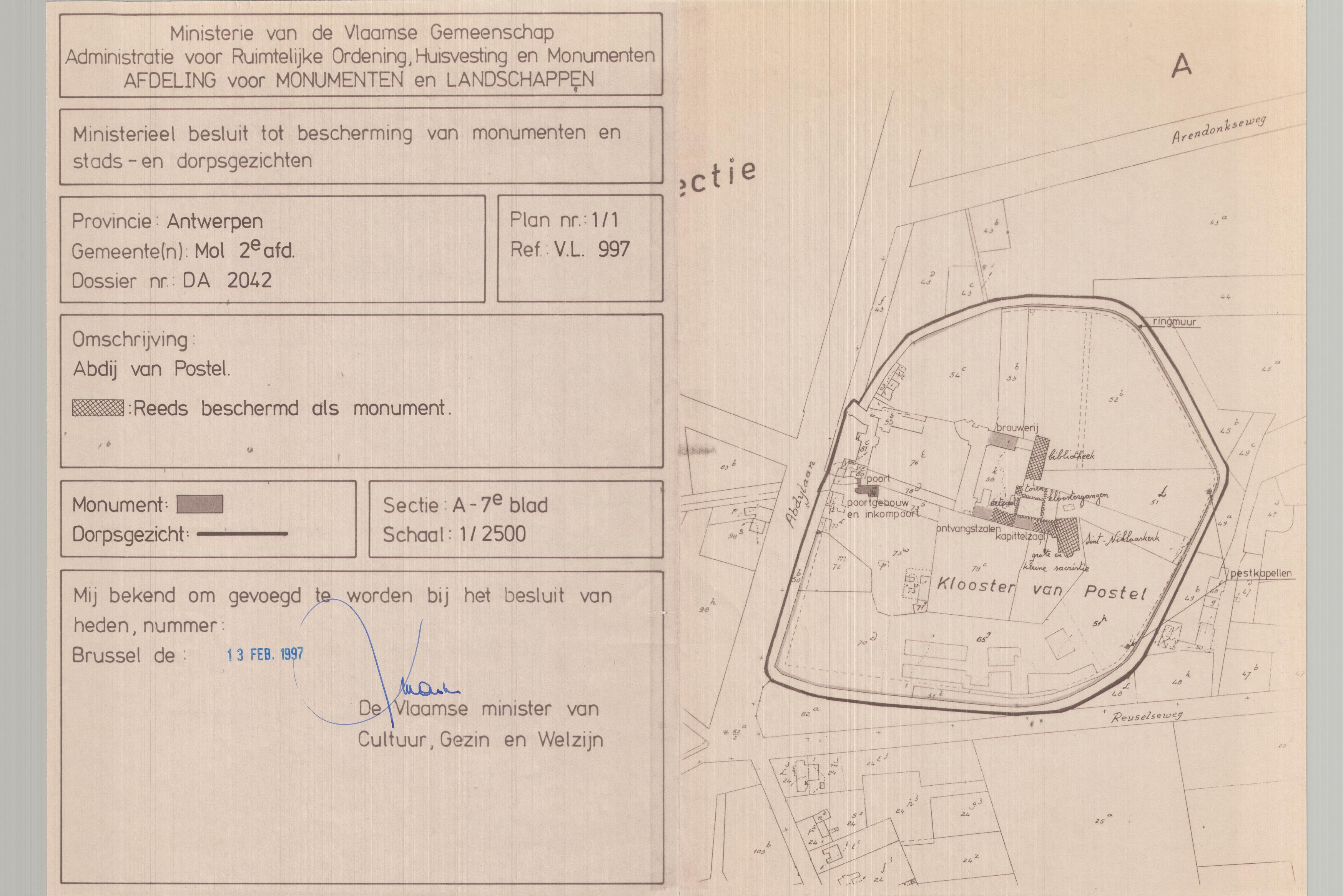 | Opmerkingen | met ringmuur, brouwerijgebouw, poortgebouw met inkompoort, kapittelzaal, ontvangstzalen en pestkapellen te Mol (Postel); OPGELET!! Op het plan is foutief weergegeven welke delen al in eerdere besluiten (13 en 347) werden beschermd. De aangeduide bibliotheek is een nieuwbouw uit 1960, terwijl besluit 347 uit 1955 dateert. De bibliotheek die wordt beschermd in besluit 347 is wellicht de oude bibliotheek boven de refter. |